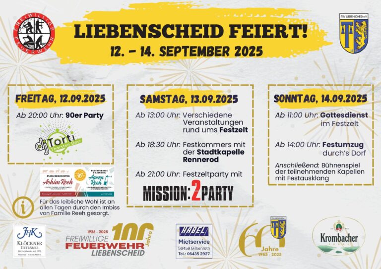 Vom 12.-14.09.2025 feiern wir 100 Jahre Feuerwehr und 60 Jahre TSV Liebenscheid